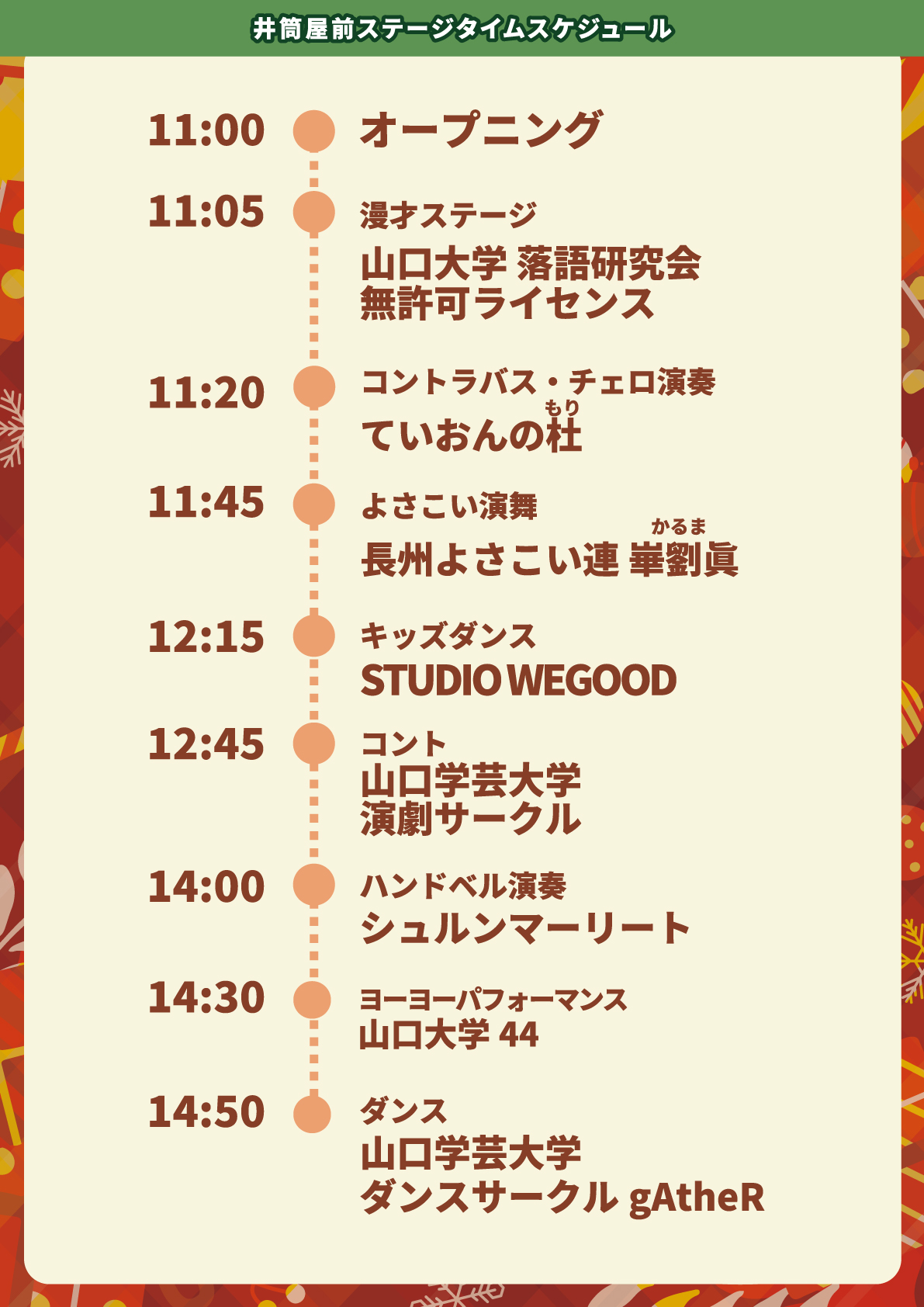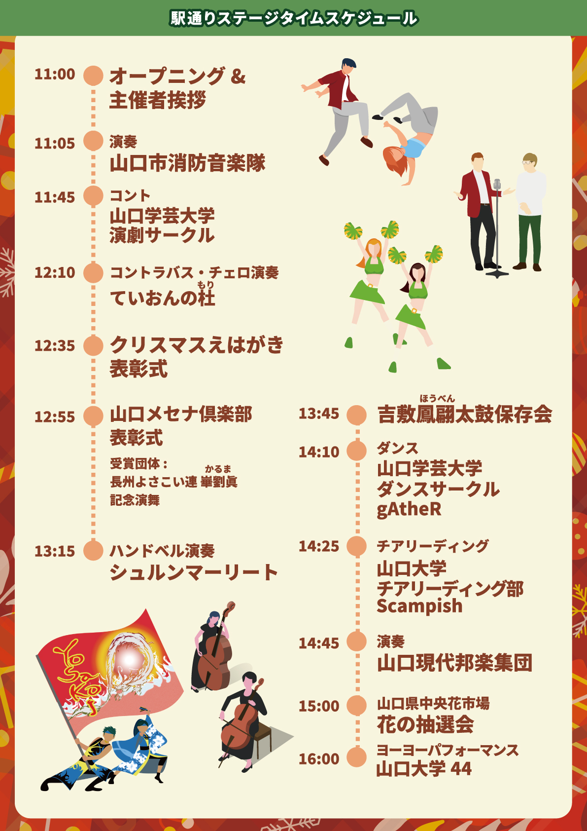 今年はステージが2か所!ヒップホップやチアダンス、演劇にハンドベルなど多彩なステージで盛り上げます!クリスマスえはがき表彰式も開催!▼ステージラインナップ